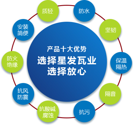 公司主要產(chǎn)品有《星發(fā)牌》合成樹脂瓦、APVC防腐耐候復合瓦、APVC發(fā)泡隔熱瓦、PVC半透明瓦、PVC防腐隔熱瓦、PVC防腐瓦、PVC防腐平板、PVC條紋板和ASA/PVC超耐候復合瓦等產(chǎn)品。產(chǎn)品一經(jīng)推出,已被廣泛應用于國內(nèi)各類平改坡項目和大型工業(yè)項目,遠銷歐洲、亞洲、美洲和非洲等國外市場,還獲選為廣州亞運會、深圳大運會、四川災后重建等工程項目的應用產(chǎn)品。公司在不斷創(chuàng)新和改革的基礎上,力求以更好的產(chǎn)品、優(yōu)良的服務,用心、專心服務好每一個客戶。